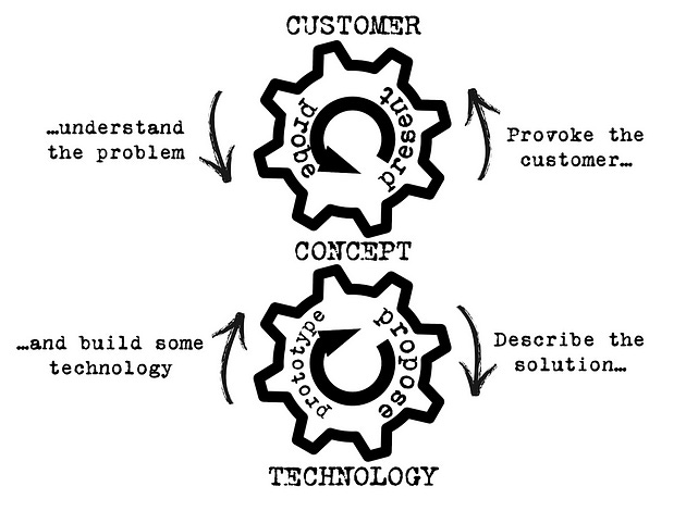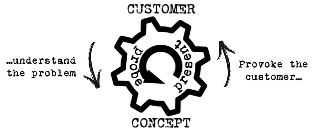 It’s your call, but the source is the customer and their problem. This is where you might start this journey to define an elegant and exciting concept, to feed back to the customer for their approval. This cycle might look like this.