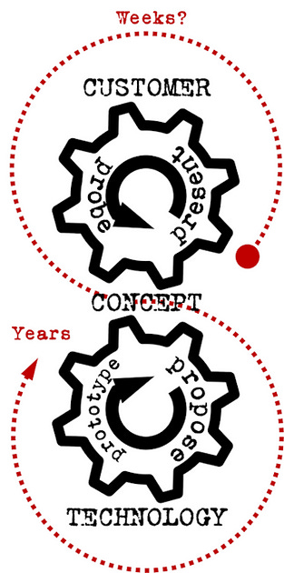 The technology development loop turns orders of magnitude slower than the customer discovery exercise. Therefore, if we start our design process with the customer problem, we may very well be committing ourselves to a decade of research before we eventually arrive at a technology that solves this problem.